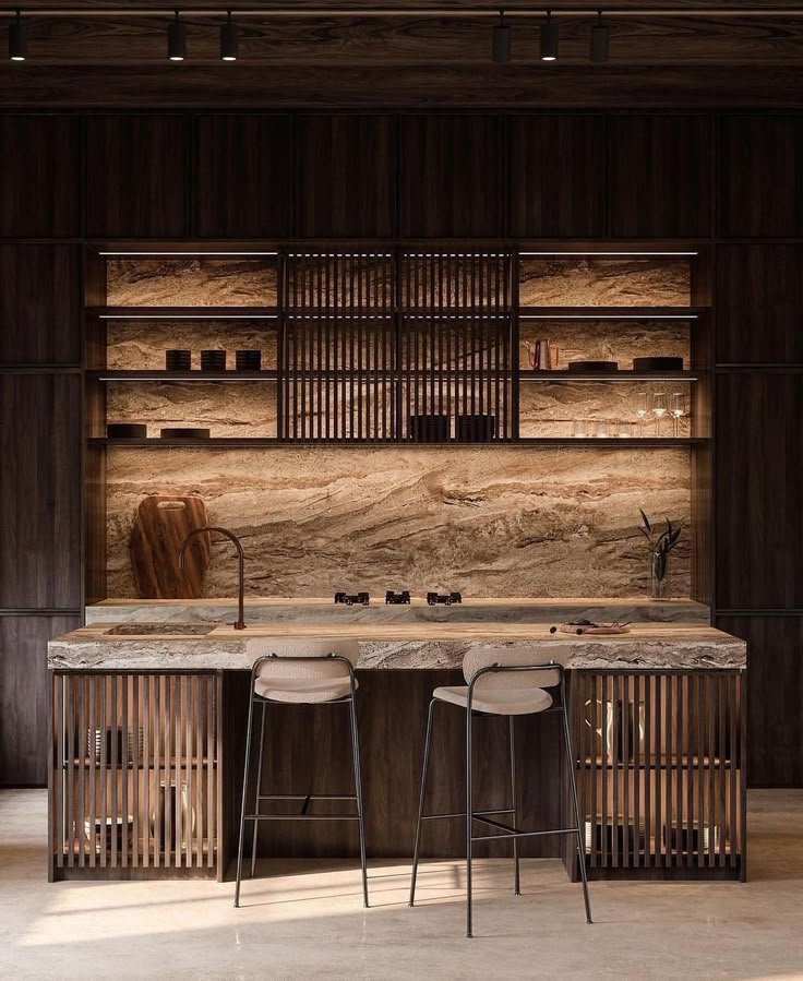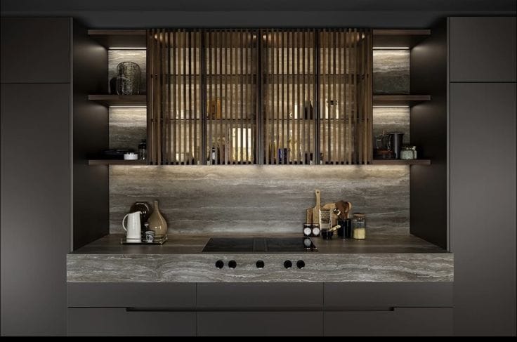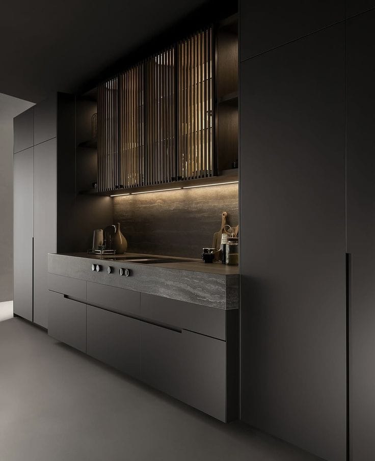 This photo showcases a sleek, modern kitchen design. The kitchen features a dark, wooden backdrop with minimalist shelving, highlighted by soft lighting.