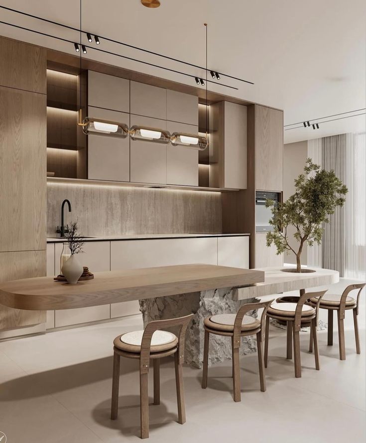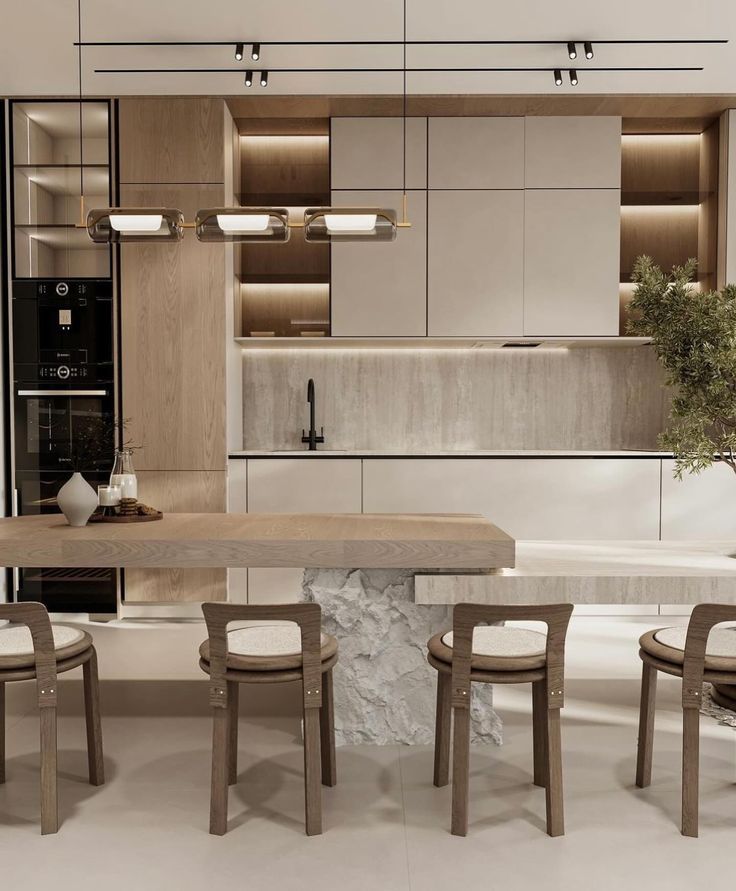 minimal with light wood and neutral tones, complemented by soft under-cabinet lighting. Simple wooden chairs and a potted