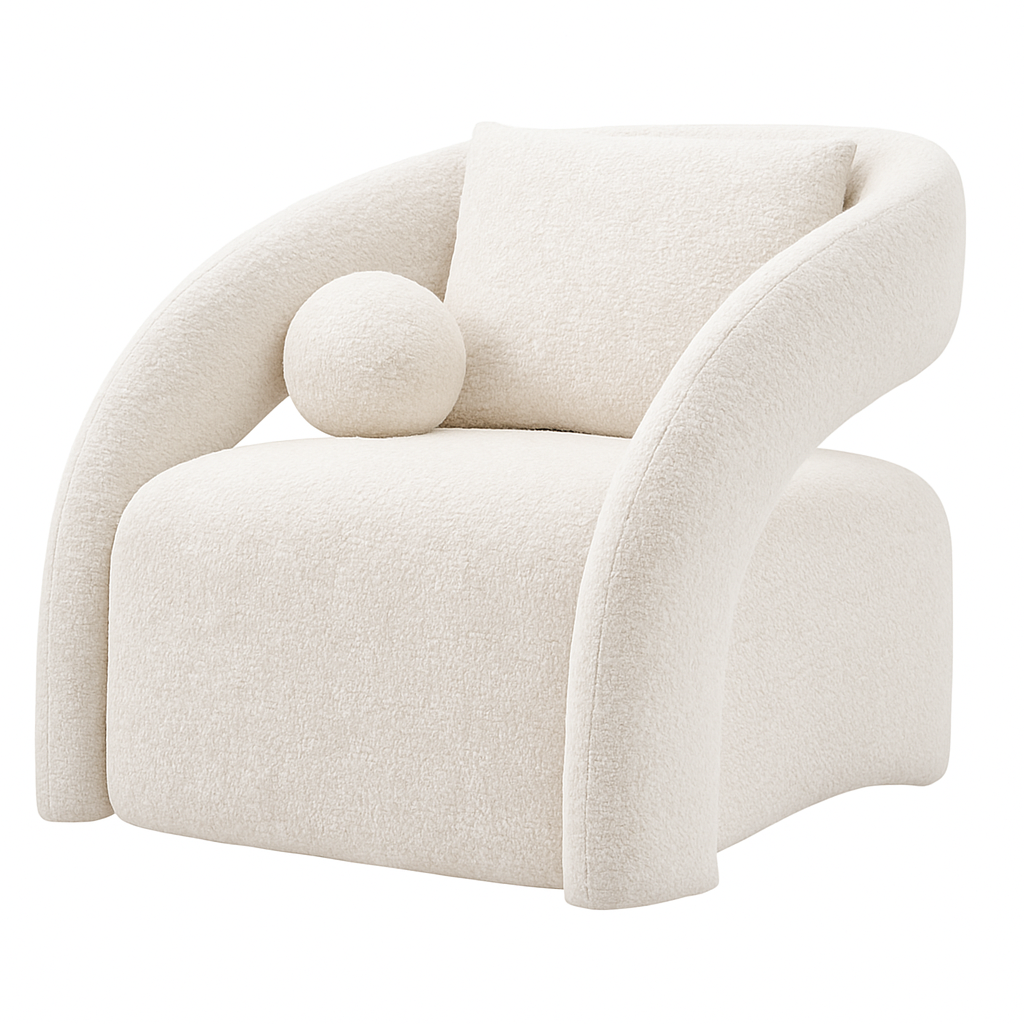 The Cocoon Armchair blends sculptural elegance with modern coziness. Its sweeping curved armrests embrace the seat, creating a soft cocoon-like effect that invites relaxation. Upholstered in plush fabric, it comes with a matching back cushion and a playful round throw pillow for added comfort and style.