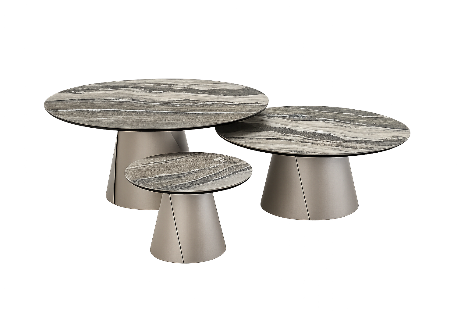 The Cora Table blends a circular top with a sculptural conical base, embodying balance and timeless elegance. Its architectural design makes it a refined focal point in any setting.