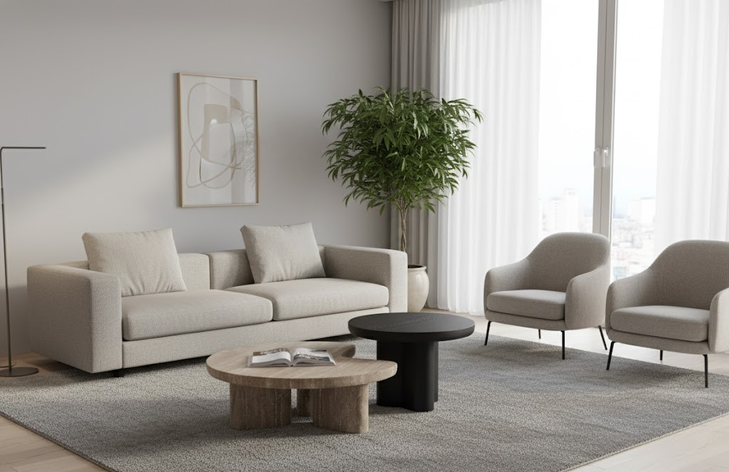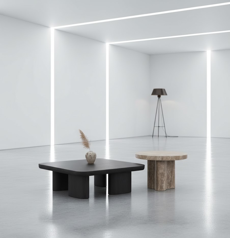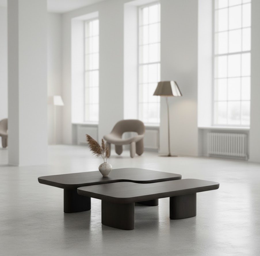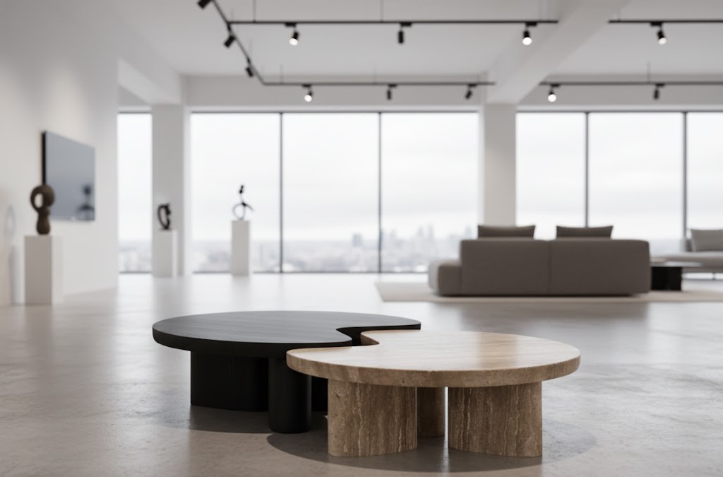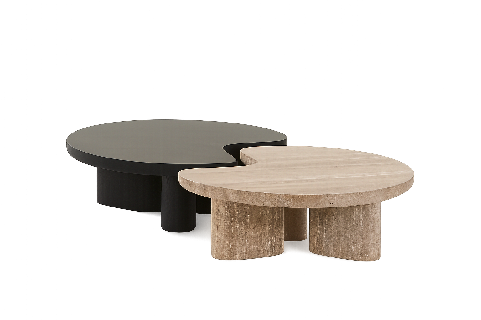 The Duo Table features two interlocking circular forms supported by bold cylindrical bases. Balanced and sculptural, it creates a harmonious centerpiece for contemporary spaces.
