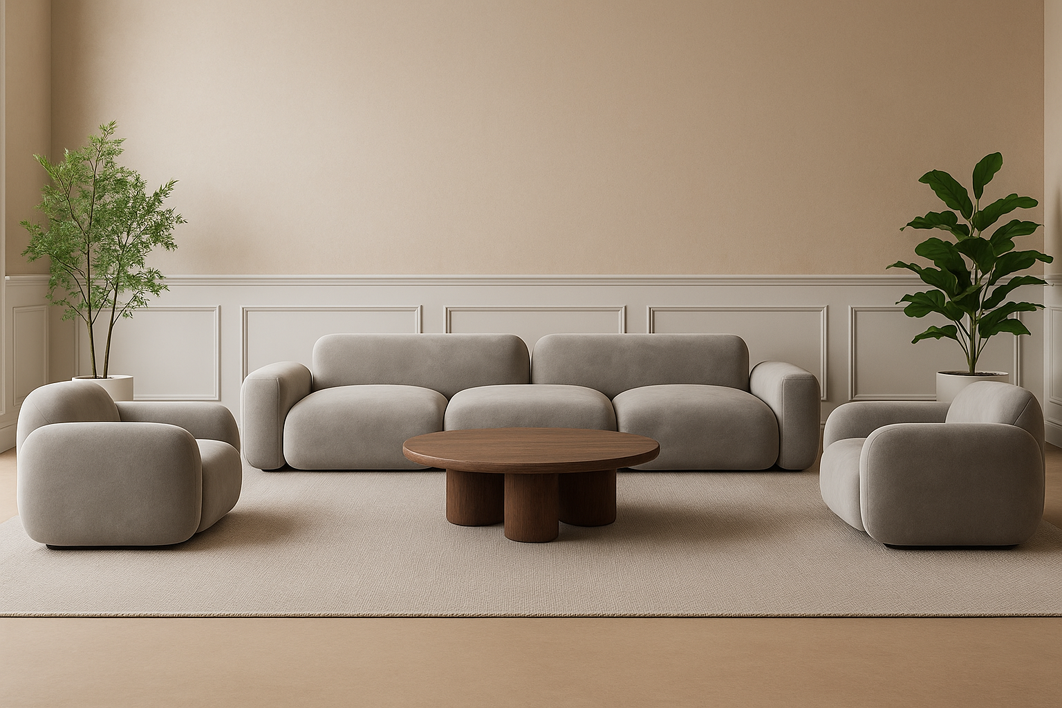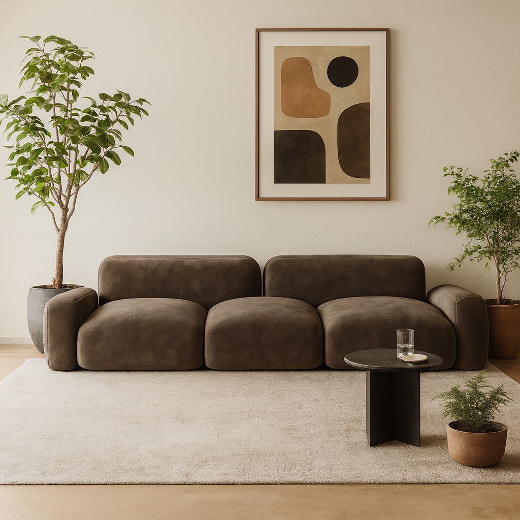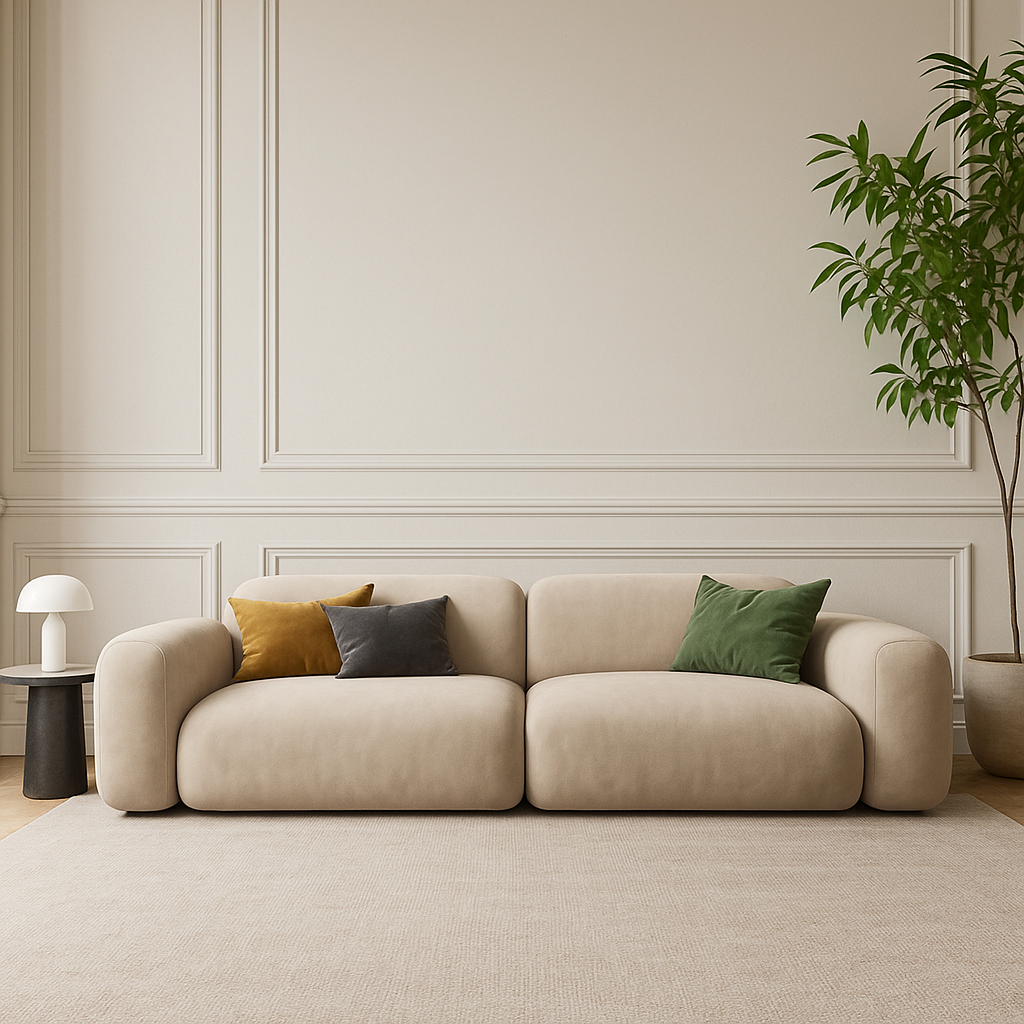 The Mellow Sofa is designed for effortless relaxation. Its soft geometry and pillowy volumes create a space that is both inviting and timeless.
