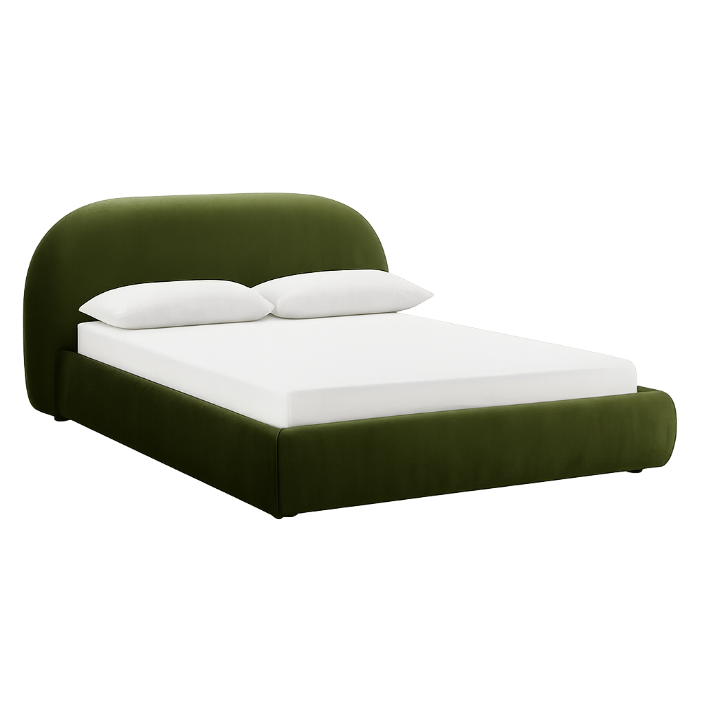The Sereno Bed features a modern, minimalist design with smooth, rounded lines that bring comfort and warmth to any bedroom. Its fully upholstered frame creates a sense of luxury and coziness, while the rich green tone adds a natural, calming atmosphere – perfect for rest and relaxation.