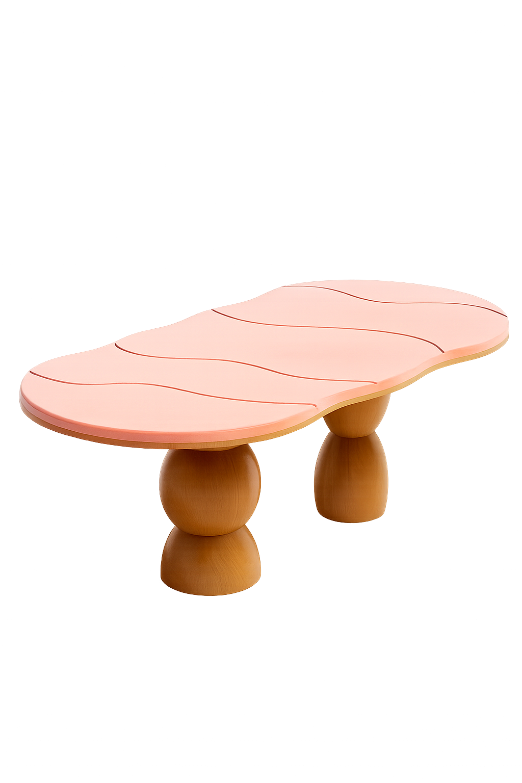A stunning blend of form and texture, The Ripple Table features an organically shaped, matte dusty-pink top set upon four traditional bobbin-style legs in natural wood. Its graceful curves and contrasting materials make it a unique, statement-making centerpiece.