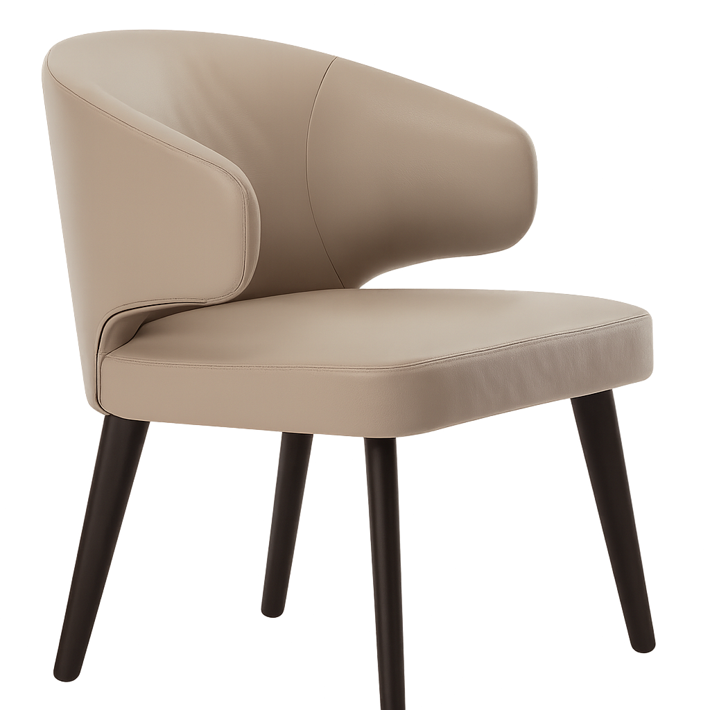 The Velora Chair combines sleek contours with timeless elegance. Its enveloping backrest and tapered legs create a refined balance between comfort and sophistication for dining spaces.