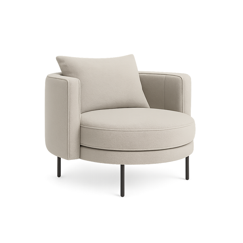 The Vero Armchair is a contemporary lounge chair defined by its rounded seat base, slim cylindrical legs, and plush cushioning. The additional loose pillow backrest provides superior comfort, while the geometric design makes it a statement piece for any modern setting. Its compact yet inviting form makes it ideal for living rooms, lounges, or boutique interiors where comfort meets style.