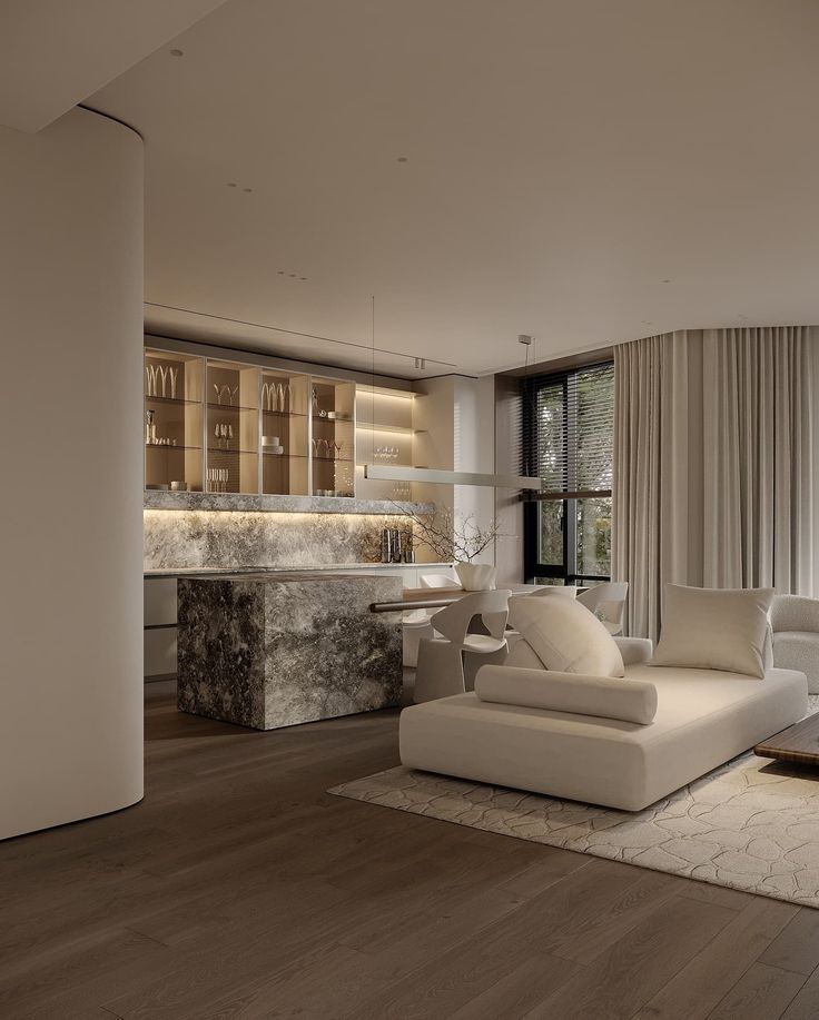 This is a modern kitchen with a marble island and sleek, light-colored cabinets. Glass shelves are lit with soft lighting, and a wooden dining table with white chairs completes the minimalist design. The light wood floors and warm lighting create an elegant, airy atmosphere.