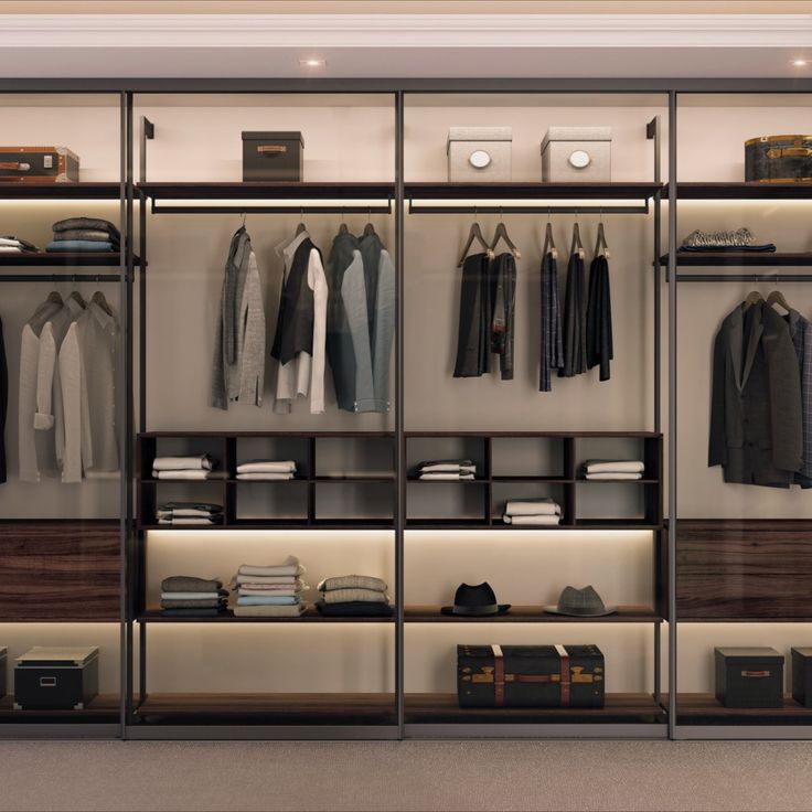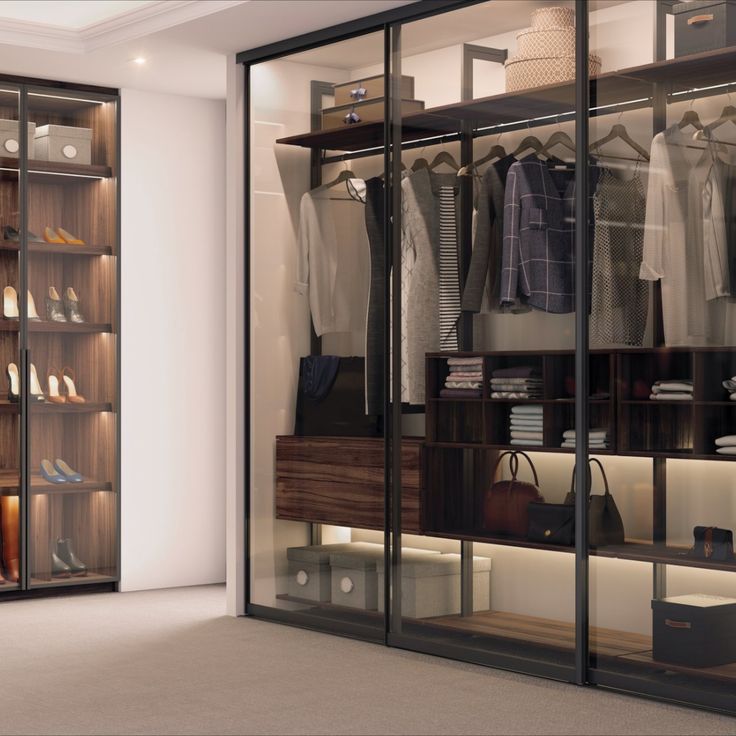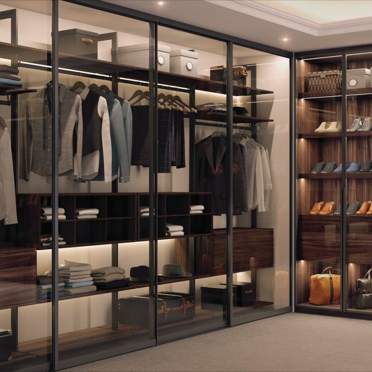 This cabinet shows a sleek glass-front wardrobe with warm wood finishes, soft built-in lighting, and neatly arranged clothes, shoes, and accessories. The design blends elegance with functionality, creating a refined storage space.